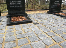 После создания основания мы покрыли территорию места захоронения гранитной брусчаткой, параллельно с этим установив заранее изготовленные памятники и цветники. Затем вернули на место металлическое ограждение и засыпали цветники и площадь перед брусчаткой корой. Этап работ на снимках не отображён, однако на приведённых ниже фото отлично виден итоговый результат.